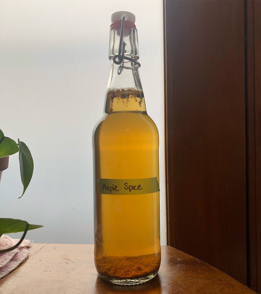 All in all, this week has been a week of treading water. Two steps forward and one step back. One small bright spot was a finished ferment; the maple kombucha finished on the 13th, and I bottled some of it with quatre epices (cinnamon, ginger, cloves, white pepper and nutmeg), in order to make a cocktail. The rest I will simmer down into a syrup.