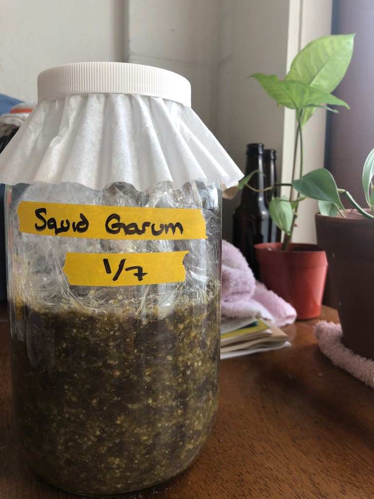 You would think that the worst thing about blended squid would be the smell, but it’s not, it’s the texture. This was the week that I decided to get the gross shit over with, and oh boy did the gross shit live up to my expectations. I made squid garum; the Noma book’s take on fish sauce. Fish sauce is made of whole fish that are blended and left to digest themselves in salt. The stomach acid and enzymes break down the flesh of their own bodies over many months and make the yummy brown stuff you put in your fried rice. Squid garum is made similarly, however the squid enzymes are aided by koji enzymes in the Noma version. The koji, as you may remember from last week, is a light green color, while the blended squid was a deep purple. After I mixed it all together with a brine, my squid garum is not very appealing to the eyes, nor is it particularly appetizing.