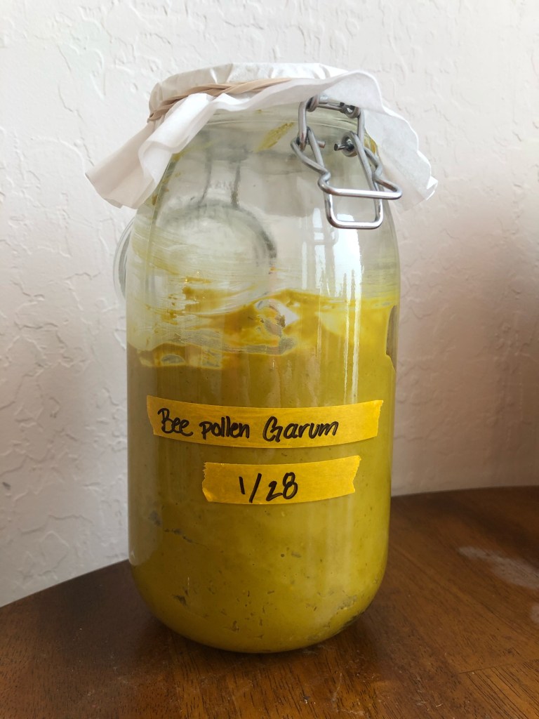 I don’t want to jinx it, but my fermenting has been relatively uneventful this week. They were all shockingly well behaved; not a single one overheated, fell over, or got cranky . I think they were testing me early on. Now that I have gained their trust, hopefully they will cooperate going forward. I tested this new found trust with my second garum, this time made of bee pollen. Bee pollen seems like one of those things that shouldn’t exist. In sixth grade I dissected a flower in science class, and I remember seeing where the pollen came from, and it wasn’t from a bee. I looked it up and apparently there is a little trap that gently scrapes the pollen that gets on the bees from the flower from their legs as they enter the hives. It honestly sounds really cute. I had never had bee pollen before, so I tried it when I was making the garum. It was floral and sweet in the way that you would expect, but it was also a bit meatier and substantial tasting than honey.