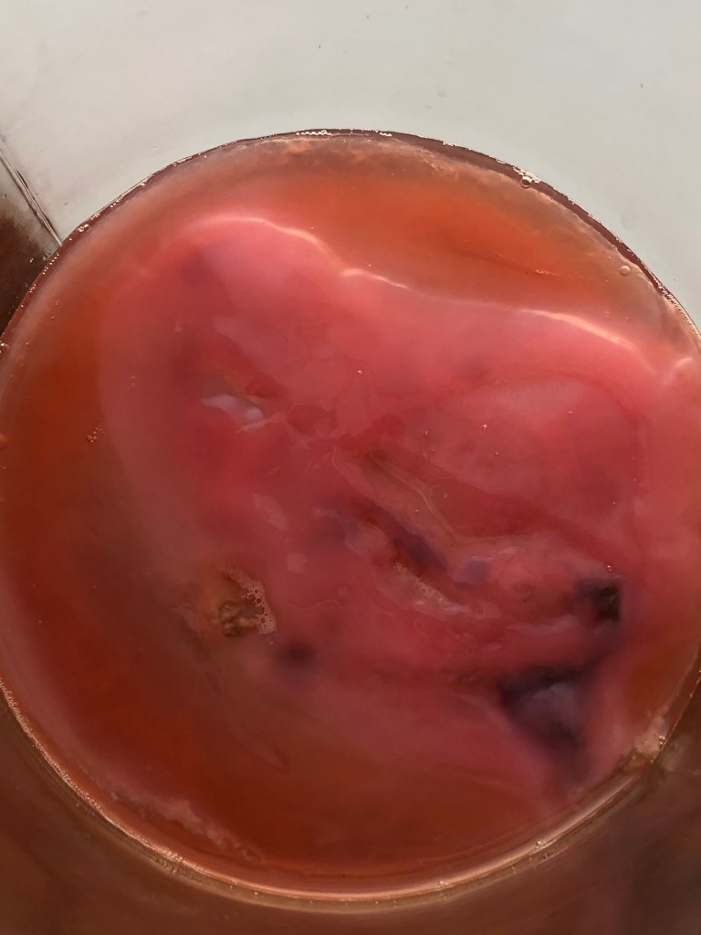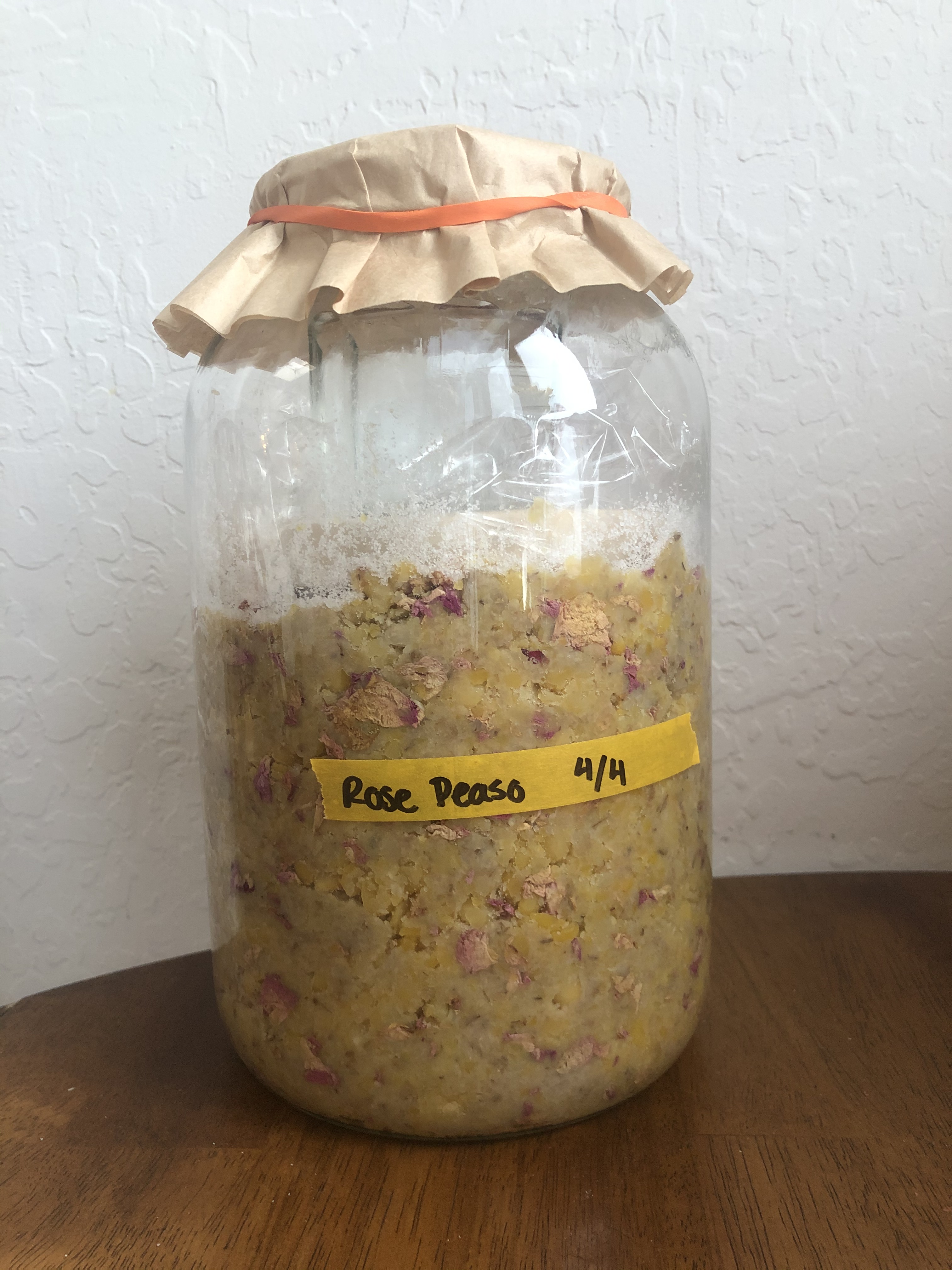 I have reached the 3-month mark in my fermentation journey, so all of the ferments that I started at the beginning of the year that take three months are just now finishing. This week my yellow pea miso finished, and yesterday my squid garum finished. This means that I am on to round two of my long term ferments. I used my new, perfect, koji to make rose pea miso. I blended the rose petals, peas, koji, and salt together and packed the miso into one of the jars, where it will stay for 3 months. I also started a short-term garum, chicken wing garum (on the right below)! It smells heavenly currently and I am excited to try it when its all done.
